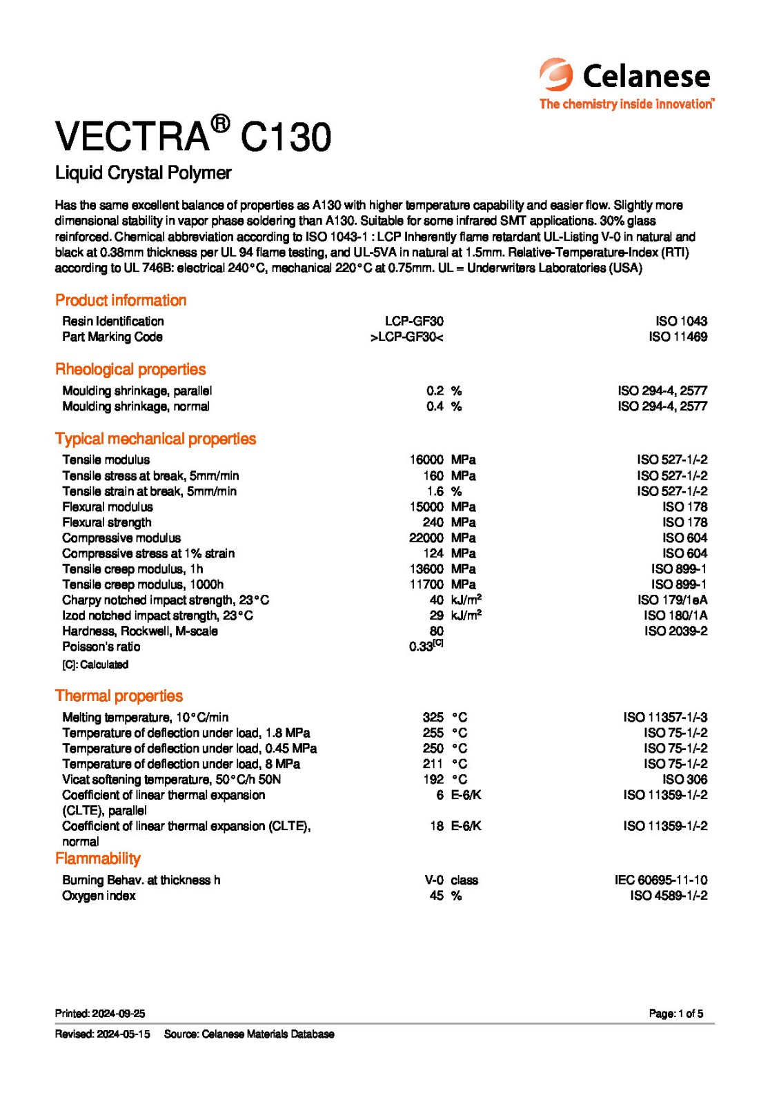 Has the same excellent balance of properties as A130 with higher temperature capability and easier flow. Slightly more dimensional stability in vapor phase soldering than A130. Suitable for some infrared SMT applications. 30% glass reinforced. Chemical abbreviation according to ISO 1043-1 : LCP Inherently flame retardant UL-Listing V-0 in natural and black at 0.38mm thickness per UL 94 flame testing, and UL-5VA in natural at 1.5mm. Relative-Temperature-Index (RTI) according to UL 746B: electrical 240°C, mechanical 220°C at 0.75mm. UL = Underwriters Laboratories (USA)